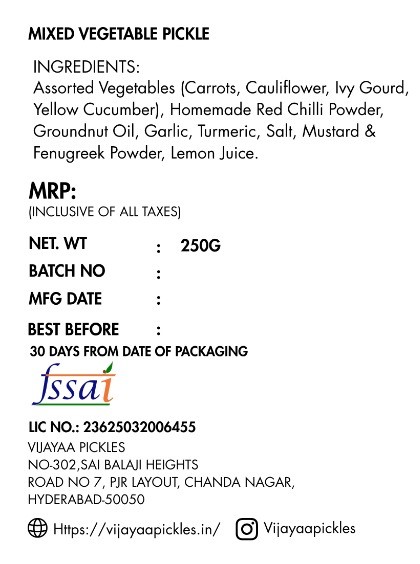 Assorted Vegetables (e.g., Carrots, Cauliflower, Ivy Gourd, etc.), Homemade Red Chilli Powder, Garlic , Turmeric, Salt, Mustard & Fenugreek Powder, Lemon Juice.